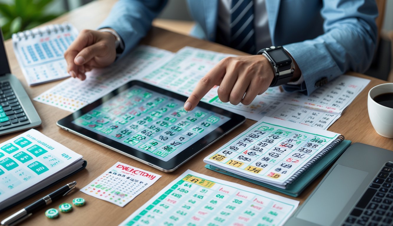 Seseorang sedang menganalisis angka dan grafik di meja kerja dengan tiket lotre dan alat tulis di sekitarnya.